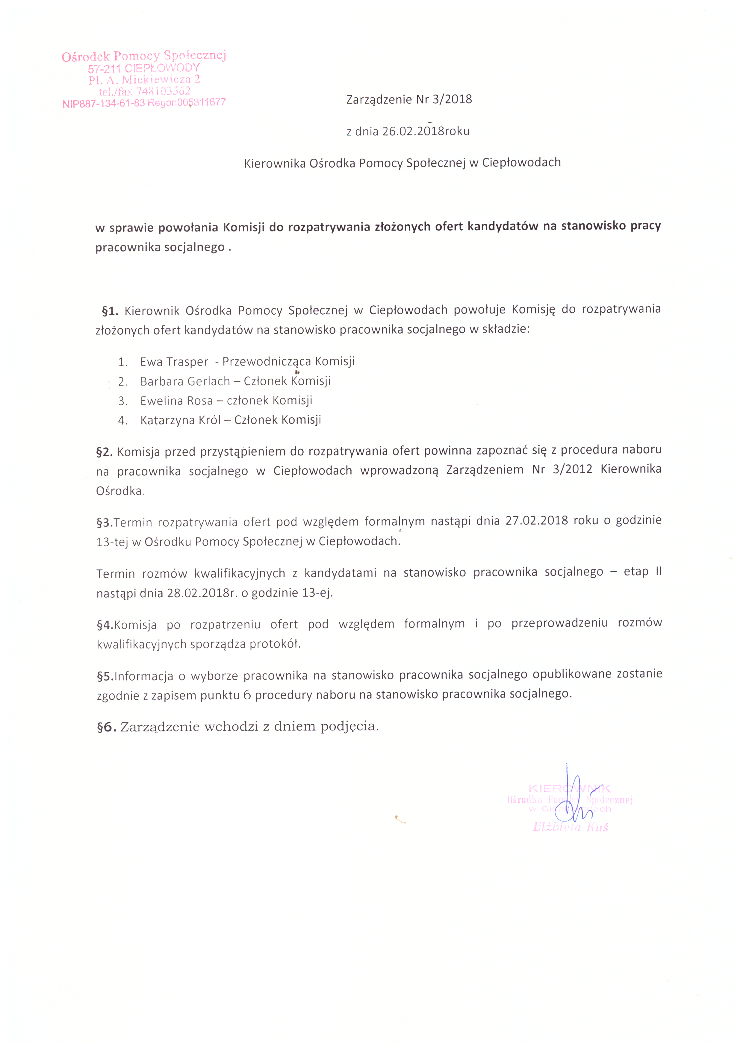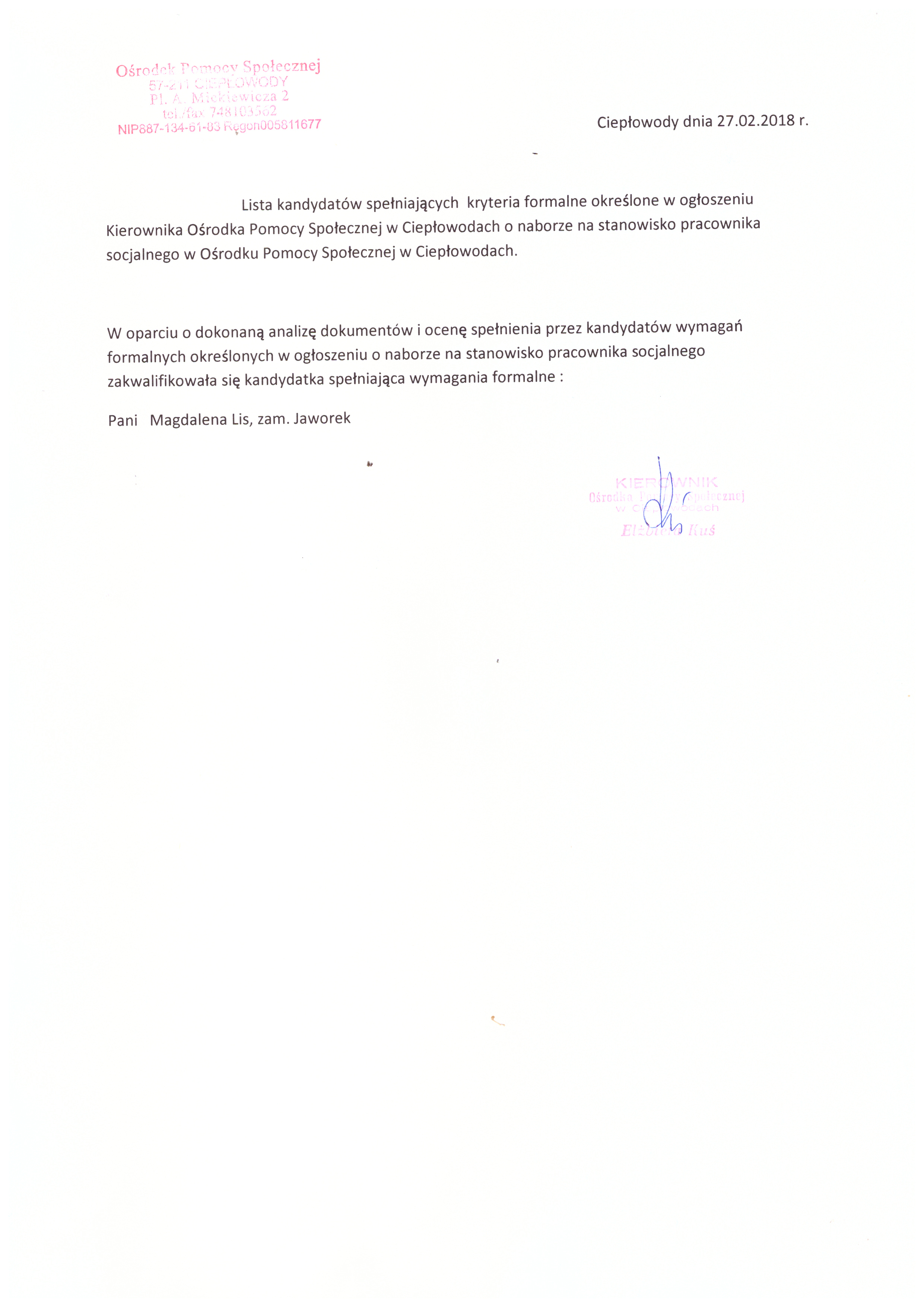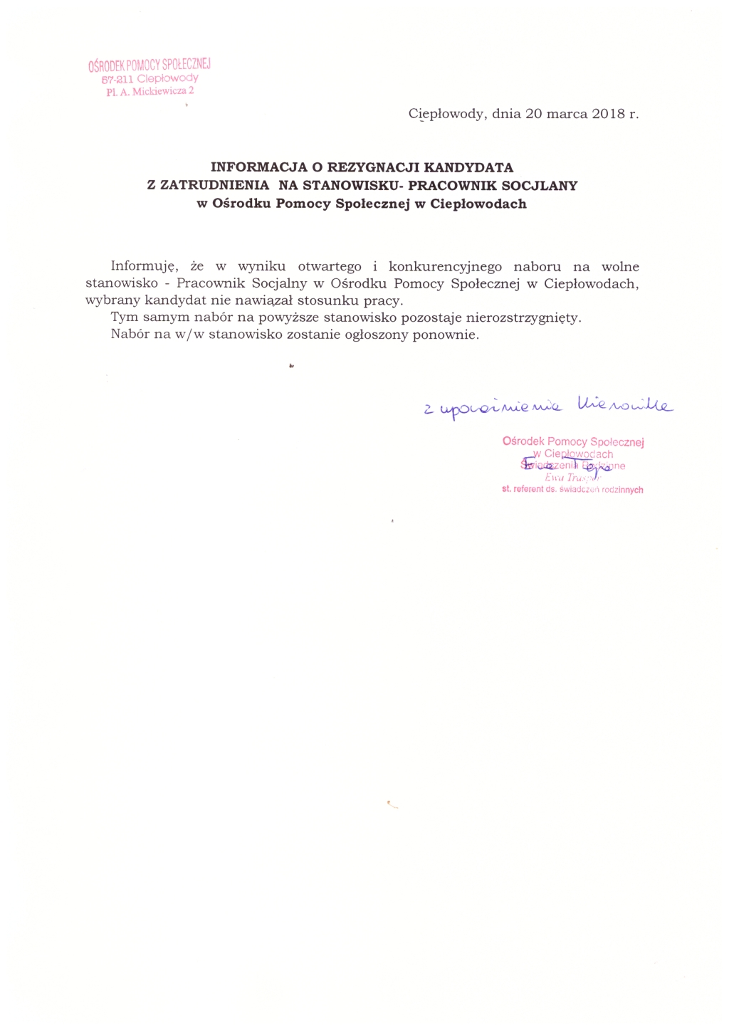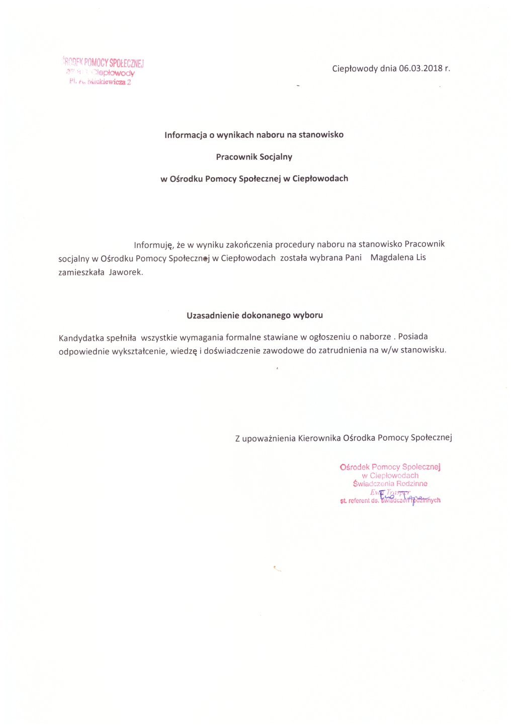 | Kierownik Ośrodka Pomocy Społecznej w Ciepłowodach ogłasza nabór na stanowisko pracy - pracownik socjalny w Ośrodku Pomocy Społecznej w Ciepłowodach |